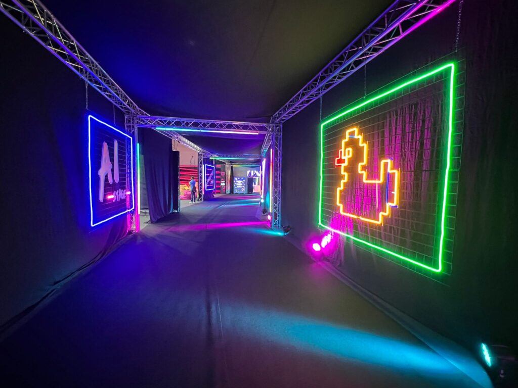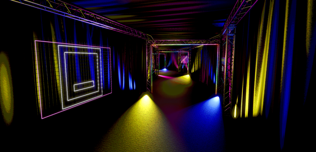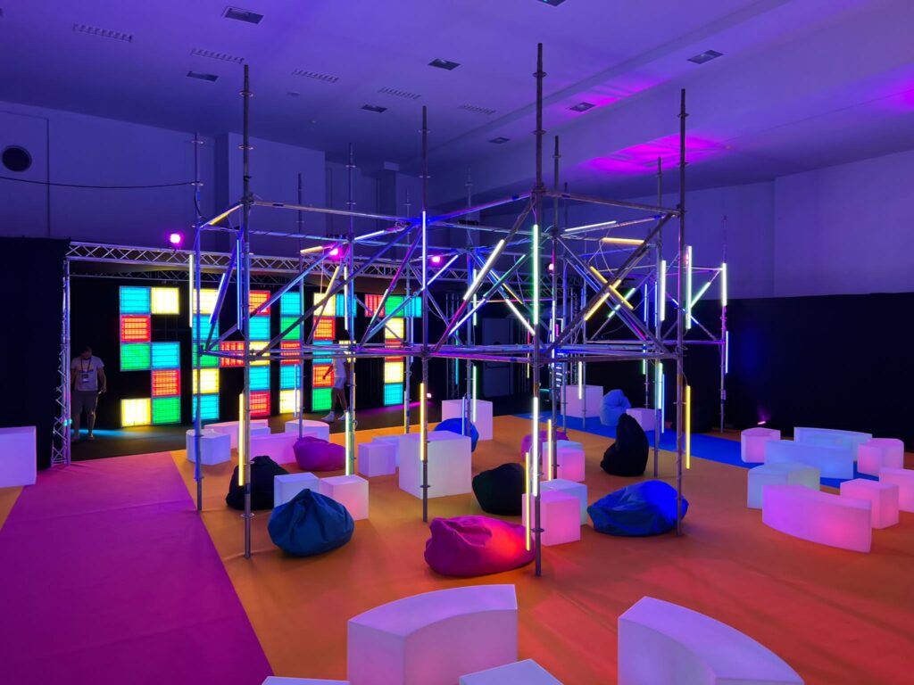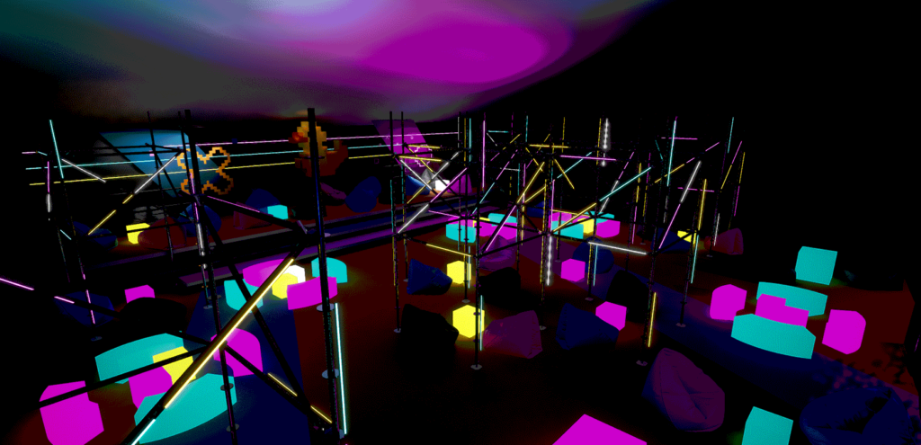 Dizajn scenografije smo klijentu predstavili kroz 3d rendere i vizualizaciju, a smjer u kojem smo odlučili ići ove godine je bio neonski-funky. Htjeli smo postići jedan futuristički izgled eventa, no s druge strane smo htjeli postići cozy / ugodan ambient u prostoru.